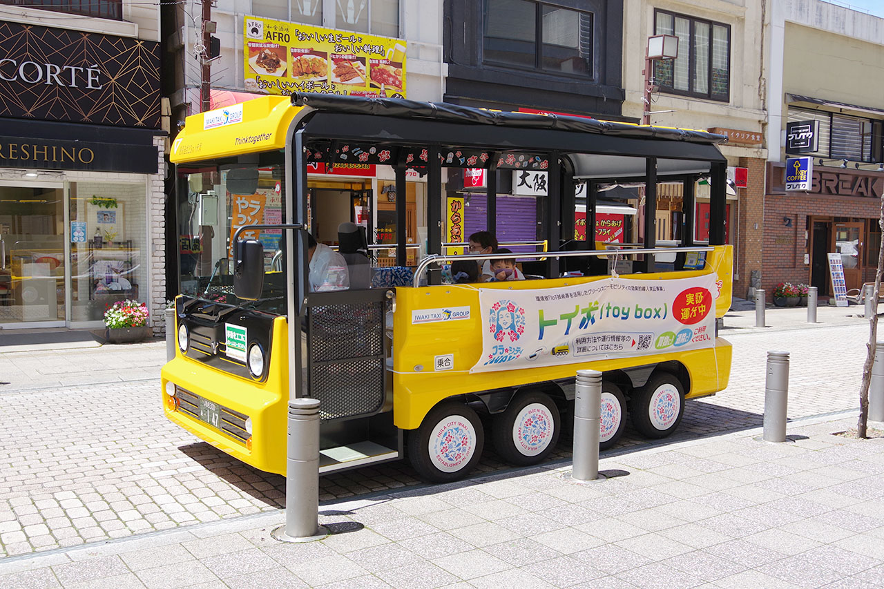 市は、環境省からIoT技術等を活用した、グリーンスローモビリティの次世代交通システム実証事業を受け、9月24日から平地区で無料走行中の黄色い低速電気バス「トイボ(toy box)」の、有料化実験を開始する。