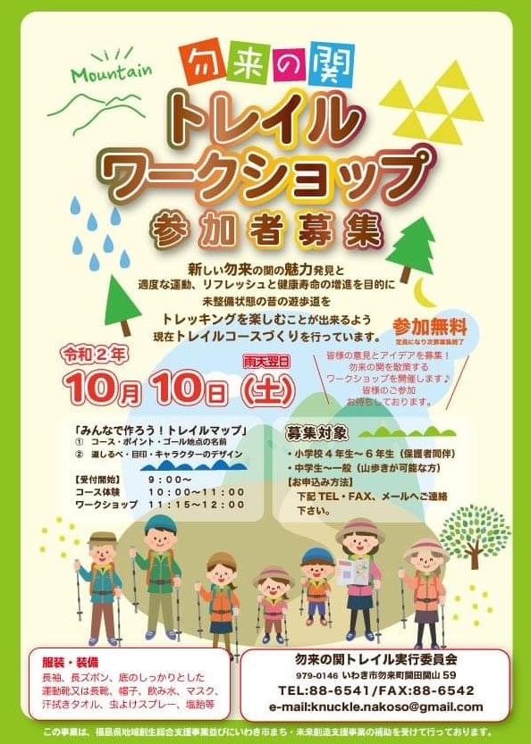 「勿来の関」付近を山歩きし、新たな魅力発見や健康増進を目的とした、勿来の関トレイル実行委員会が主催の「トレイルワークショップ」は、10月10日(※雨天時は翌日)に開催される。 同委員会は、勿来まちづくりサポートセンター、勿来ひと・まち未来... -