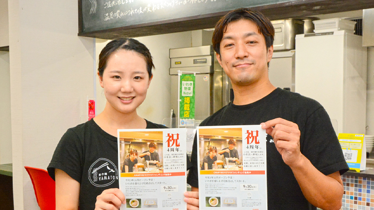 支援を呼びかける曲山代表(右)ら 平・作町のラーメン店「創作麺やま鳶」(曲山修太代表)は11月、小名浜花畑町地内に移転し、地域貢献に取り組む「コンセプトストア」として新たにオープンする。開店に先駆け、クラウドファンディングで「応援プロジェ... -